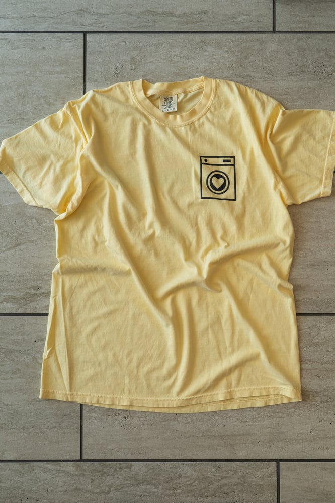 Comfort Colors brand 100% cotton yellow shirt. Black, yellow and blue print. Laundry Project icon in black print on the front and Laundry Project slogan, "Soap And Hope", in multi-color print on the back.